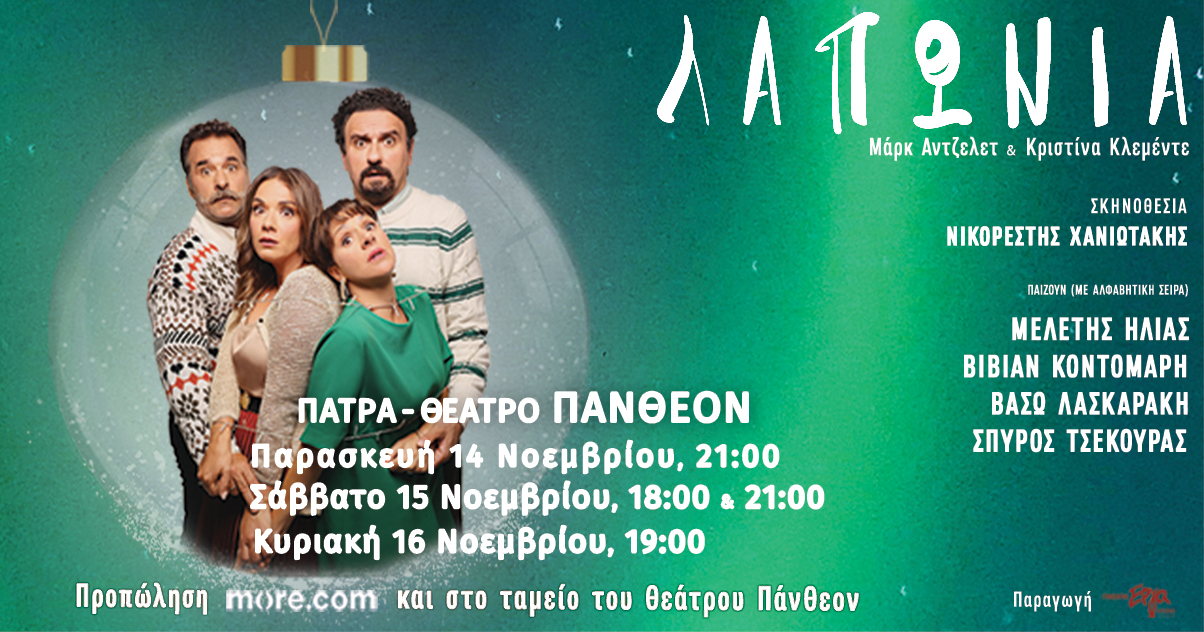 Η «ΛΑΠΩΝΙΑ» είναι μία σύγχρονη κωμωδία που ανεβαίνει για πρώτη φορά στην χώρα μας, θα παρουσιαστεί στο θέατρο Πάτρας «Πάνθεον» την Παρασκευή 14 Νοεμβρίου στις 21:00, Σάββατο 15 Νοεμβρίου 18: 00 & 21:00 και Κυριακή 16 Νοεμβρίου στις 19:00 για τέσσερις μοναδικές παραστάσεις!