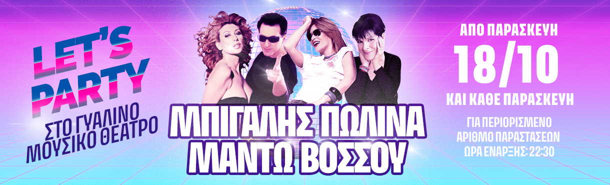 Από την Παρασκευή 18 Οκτωβρίου ο Κώστας Μπίγαλης, η Πωλίνα, η Σοφία Βόσσου και η Μαντώ θα μας περιμένουν στο Γυάλινο Μουσικό Θέατρο για να μας ξεσηκώσουν με το πιο νοσταλγικό, γεμάτο θετικά vibes πάρτι της χρονιάς. Μια γιορτή που όλοι έχουμε ανάγκη!