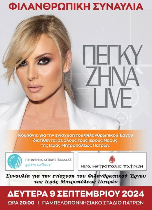 Στους πίνακες ανακοινώσεων των ιερών ναών της Μητροπόλεως Πατρών έχει αναρτηθεί η διαφημιστική αφίσα που προαναγγέλλει τη μεγάλη φιλανθρωπικού χαρακτήρα συναυλία που πρόκειται να γίνει τη Δευτέρα 9 Σεπτεμβρίου 2024 στο Παμπελοποννησιακό στάδιο με κεντρική ερμηνεύτρια την αγαπητή τραγουδίστρια Πέγκυ Ζήνα.