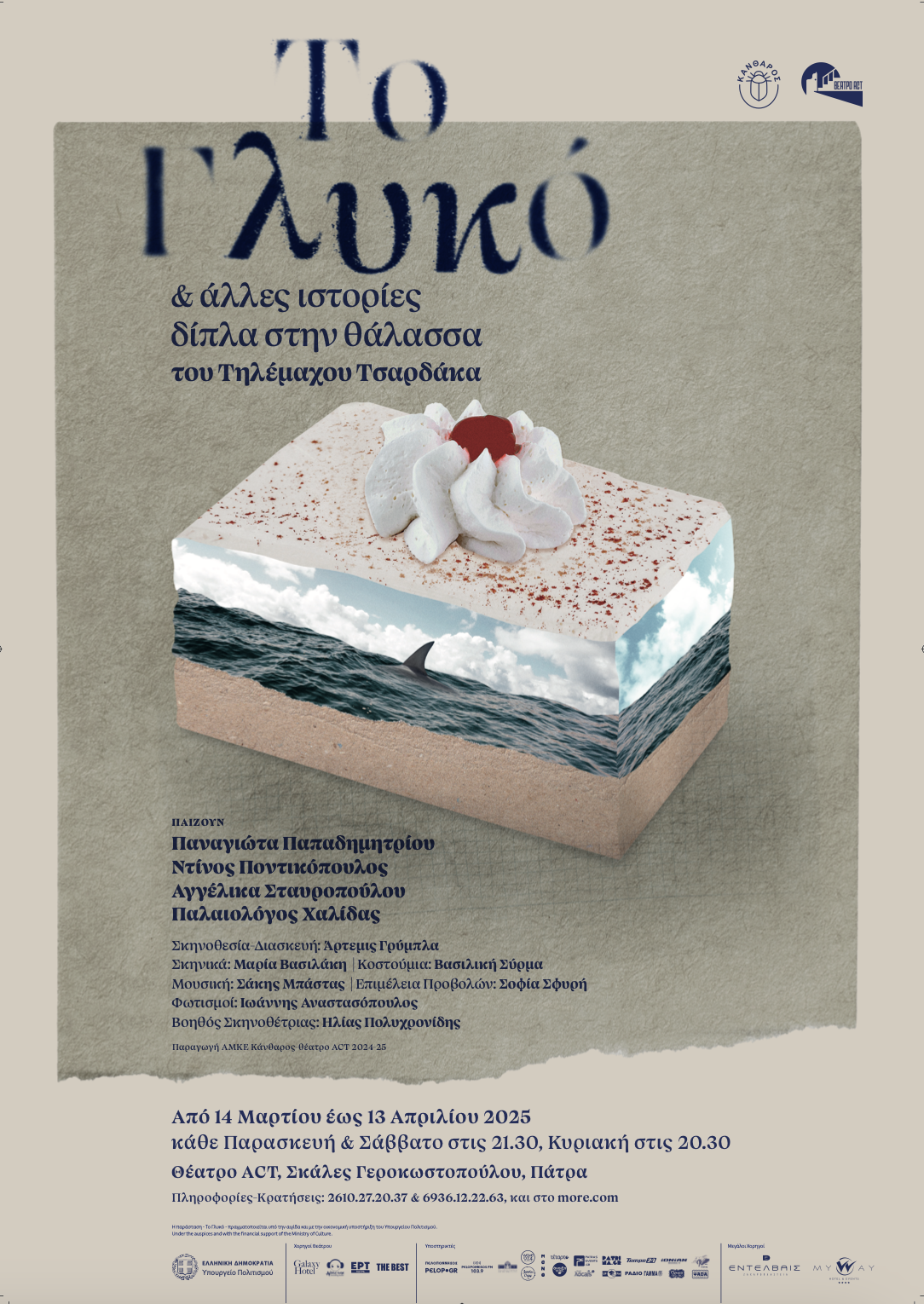 Το θέατρο act και η επαγγελματική θεατρική ομάδα Κάνθαρος παρουσιάζουν τη νέα τους κεντρική θεατρική παραγωγή με τίτλο «Το γλυκό και άλλες ιστορίες δίπλα στη θάλασσα». Μια ολοκαίνουργια θεατρική παράσταση σε σκηνοθεσία και διασκευή της Αρτέμιδος Γρύμπλα πάνω σε κείμενα του Τηλέμαχου Τσαρδάκα (Νυχτερινά Μαθήματα, Οι κάτω απ’ τ’ αστέρια, Το Σκυλί του Ωρίωνα κ.α.) από τη συλλογή διηγημάτων «Αυτός που έτρωγε όλο το γλυκό του» (Εκδόσεις Σοκόλη 2021). Πρόκειται για τη νέα συνεργασία του Τηλέμαχου Τσαρδάκα με την Άρτεμη Γρύμπλα μετά την πολύ επιτυχημένη παράσταση «Οι κάτω απ’ τ’ αστέρια» που τόσο αγαπήθηκε από το κοινό της Πάτρας αλλά και όλης της Ελλάδας.