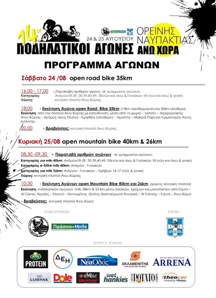 Σε υψόμετρο 1.100 μέτρα, μέσα σε δάσος από έλατα και καστανιές, ποτάμια και καταρράκτες υλοποιούνται οι 14οι open “Ποδηλατικοί Αγώνες Ορεινής Ναυπακτίας”, από την Περιβαλλοντική Οργάνωση “Πράσινο+Μπλέ”, σε συνδιοργάνωση με τον Δήμο Ναυπακτίας και με την έγκριση της Ελληνικής Ομοσπονδίας Ποδηλασίας.